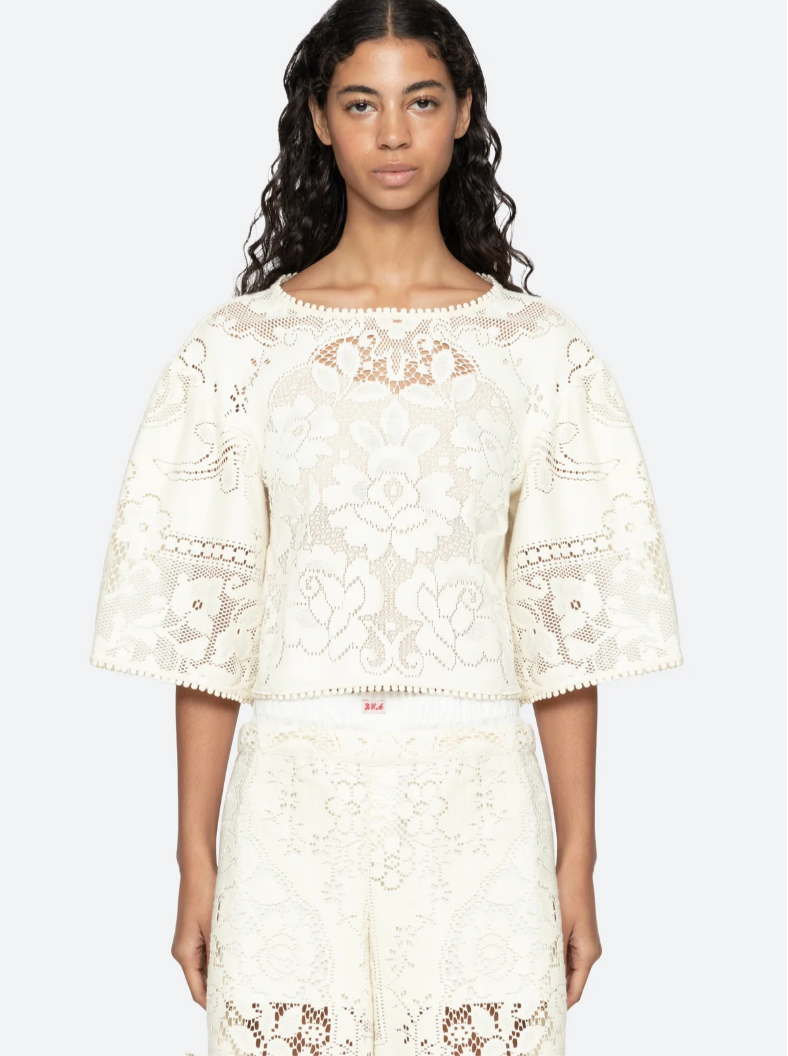 The Arianna lace top is crafted from intricate floral lace, with short sleeves and a cropped silhouette. Delicate trim along the edges adds a polished, feminine finish. Pairs perfectly with the Arianna lace culottes for a coordinated ensemble.