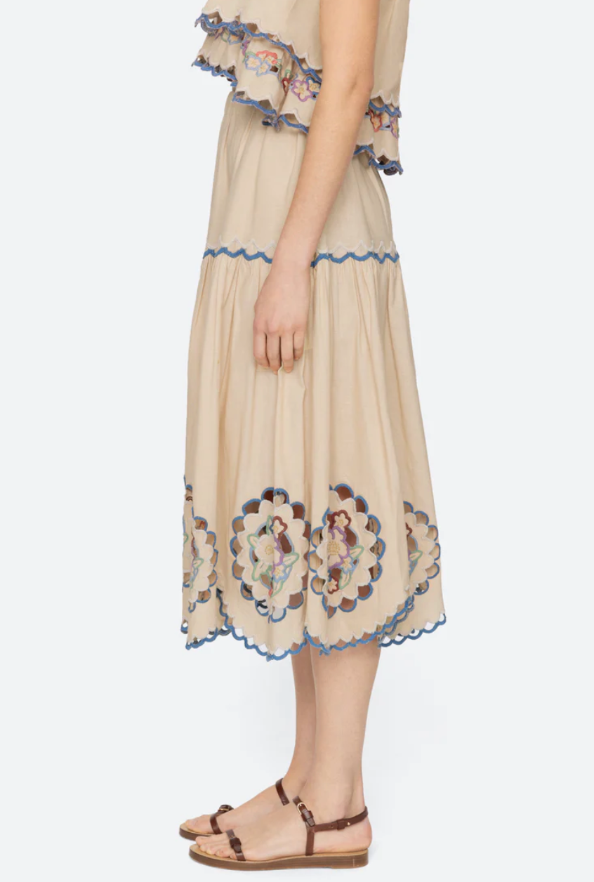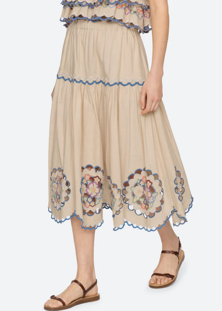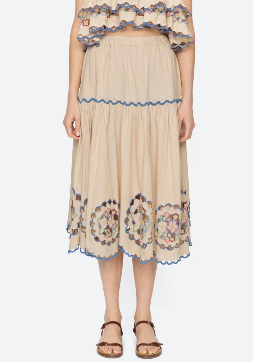 The Melinda embroidered skirt features floral embroidery throughout, sheer accents, elasticized waistband and scalloped hem.