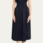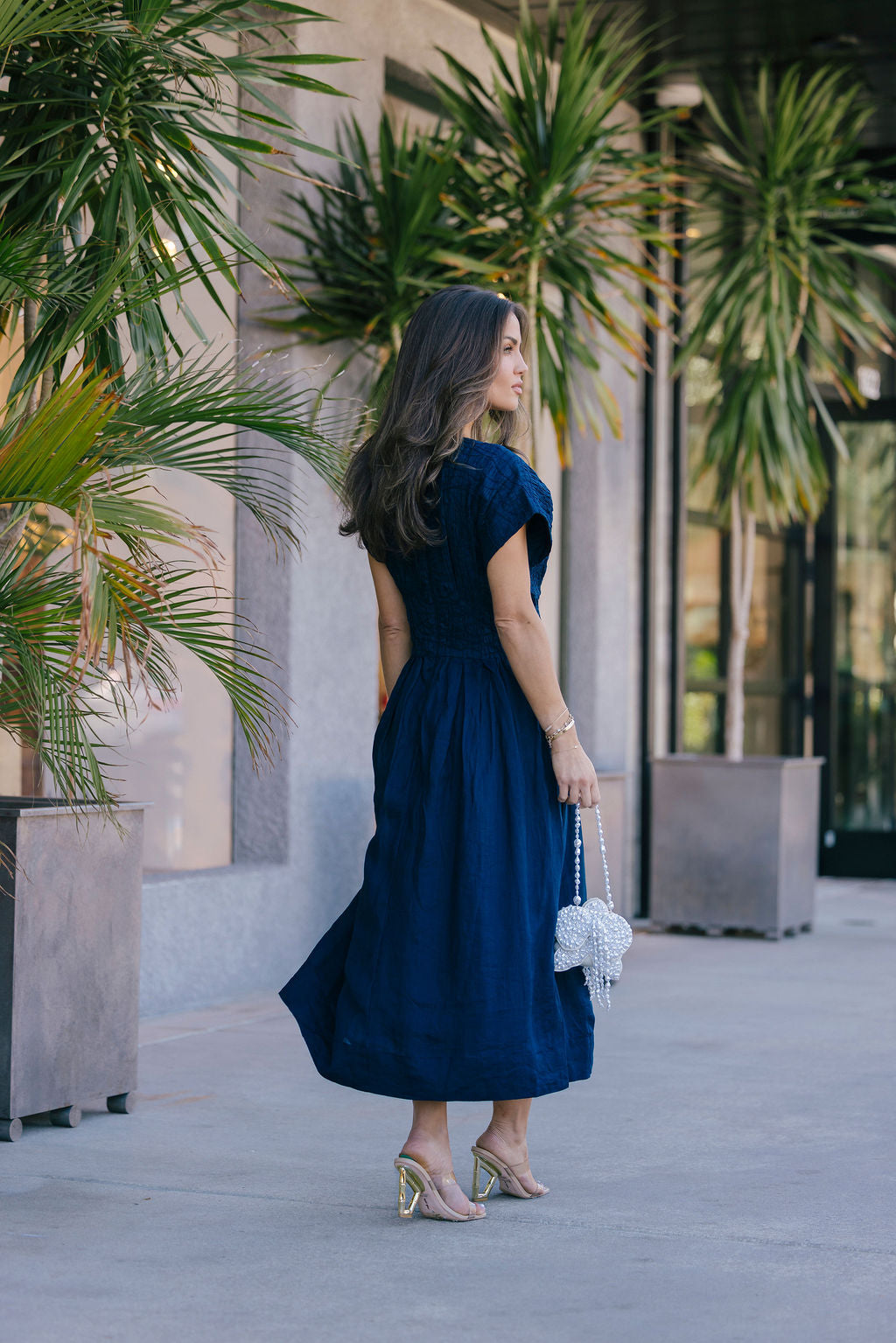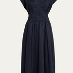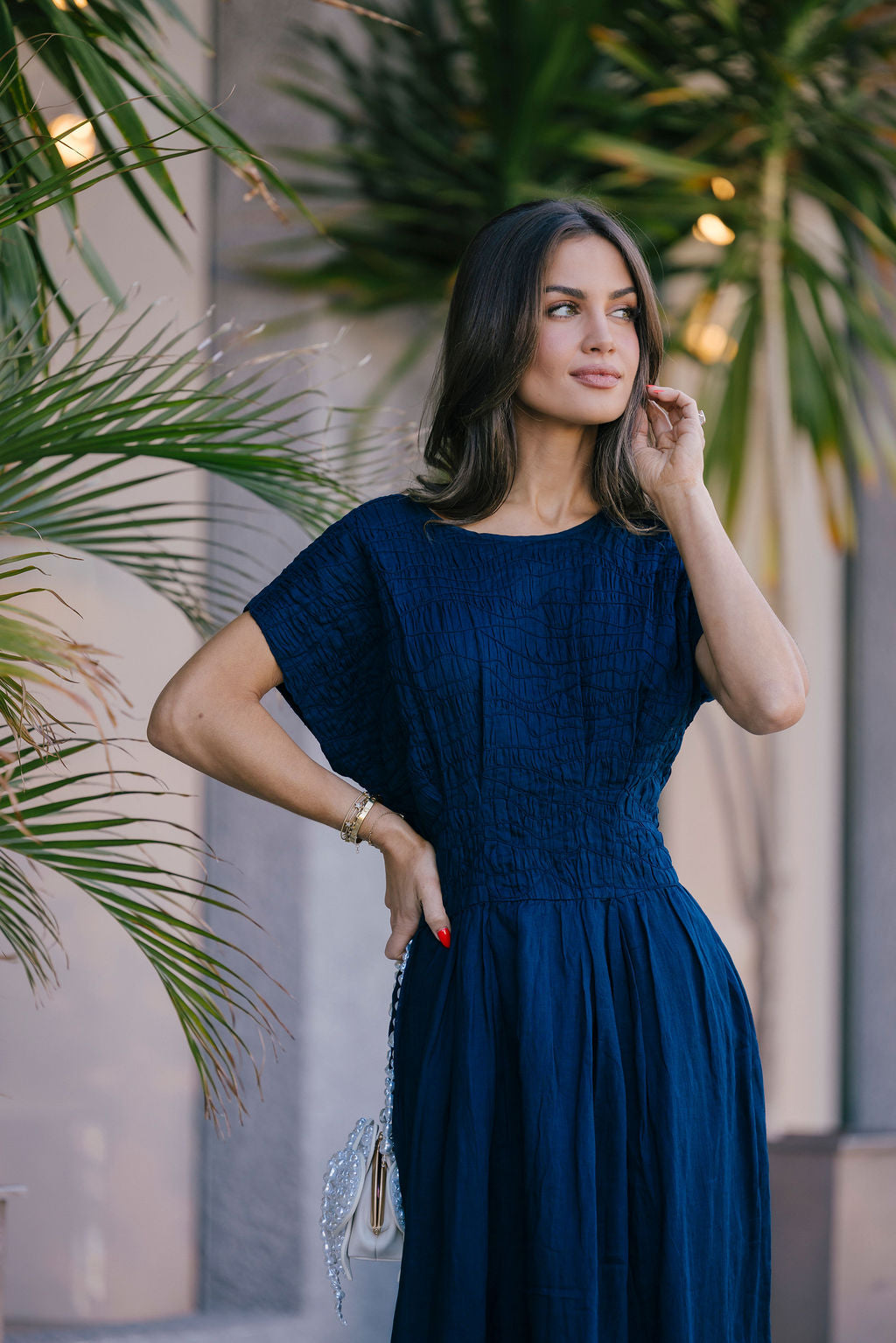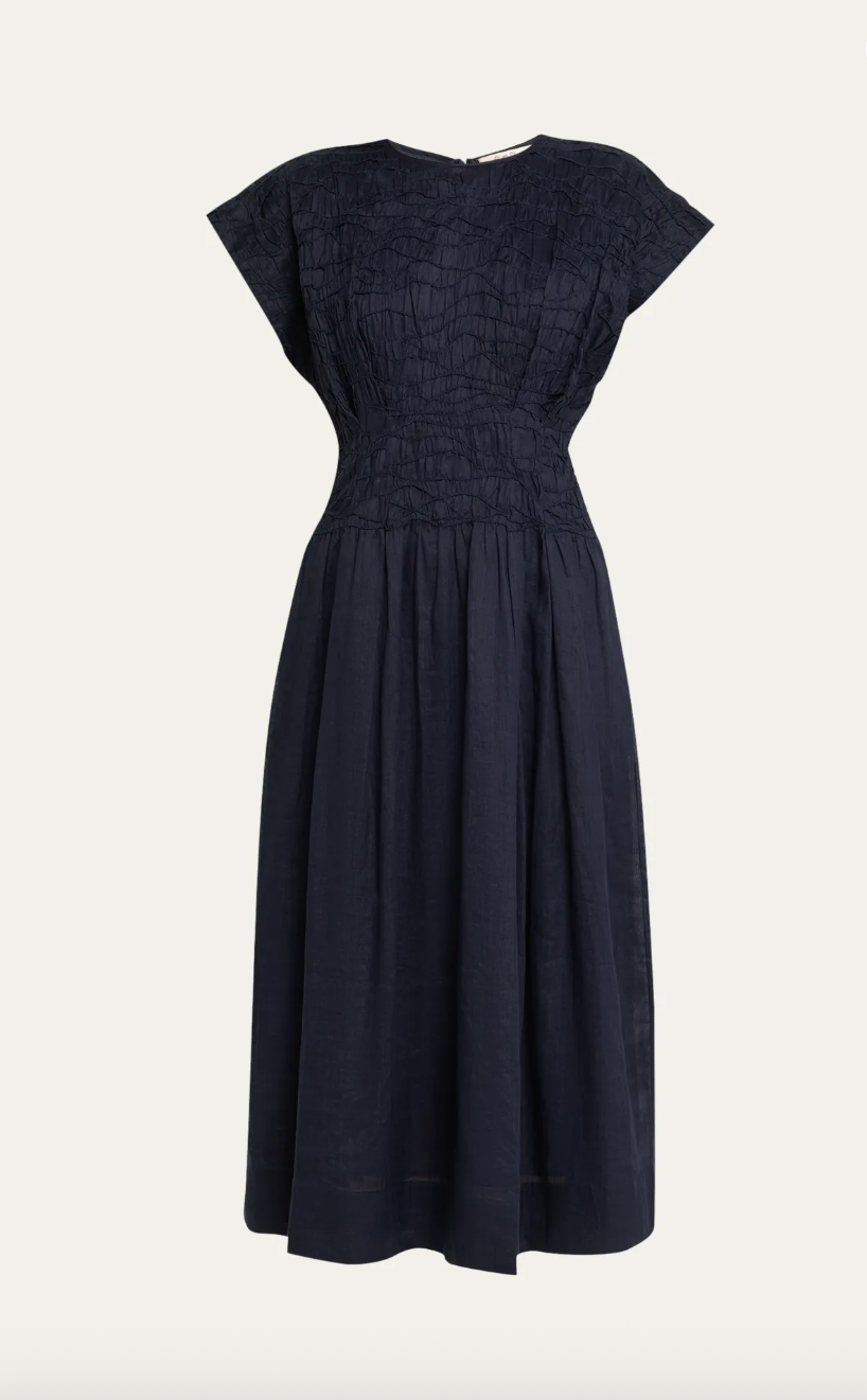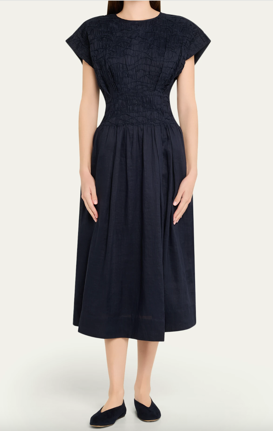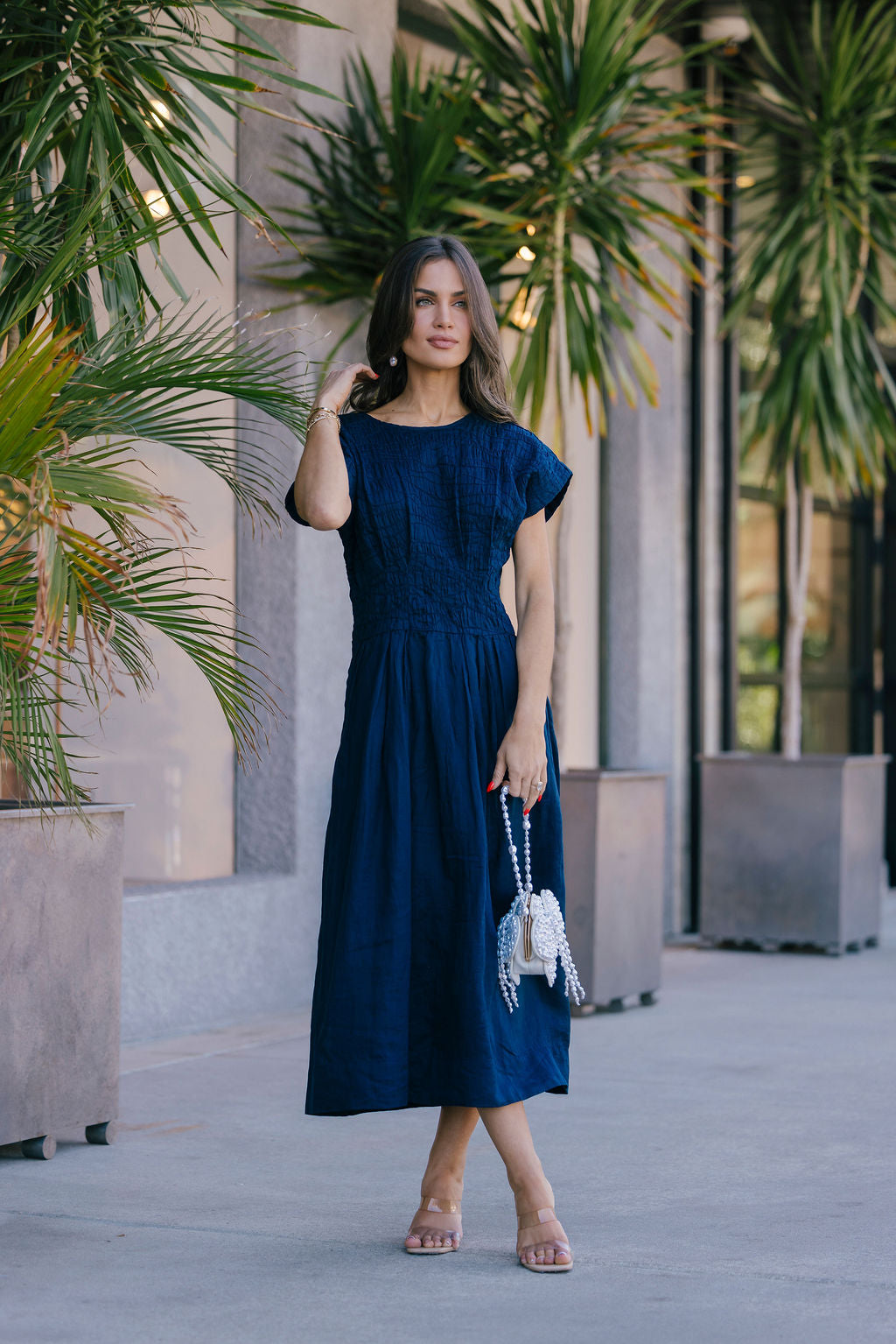 The Imogen dress features a timeless midi silhouette with intricate pintuck detailing. Short sleeves add a touch of ease to its refined, feminine design.