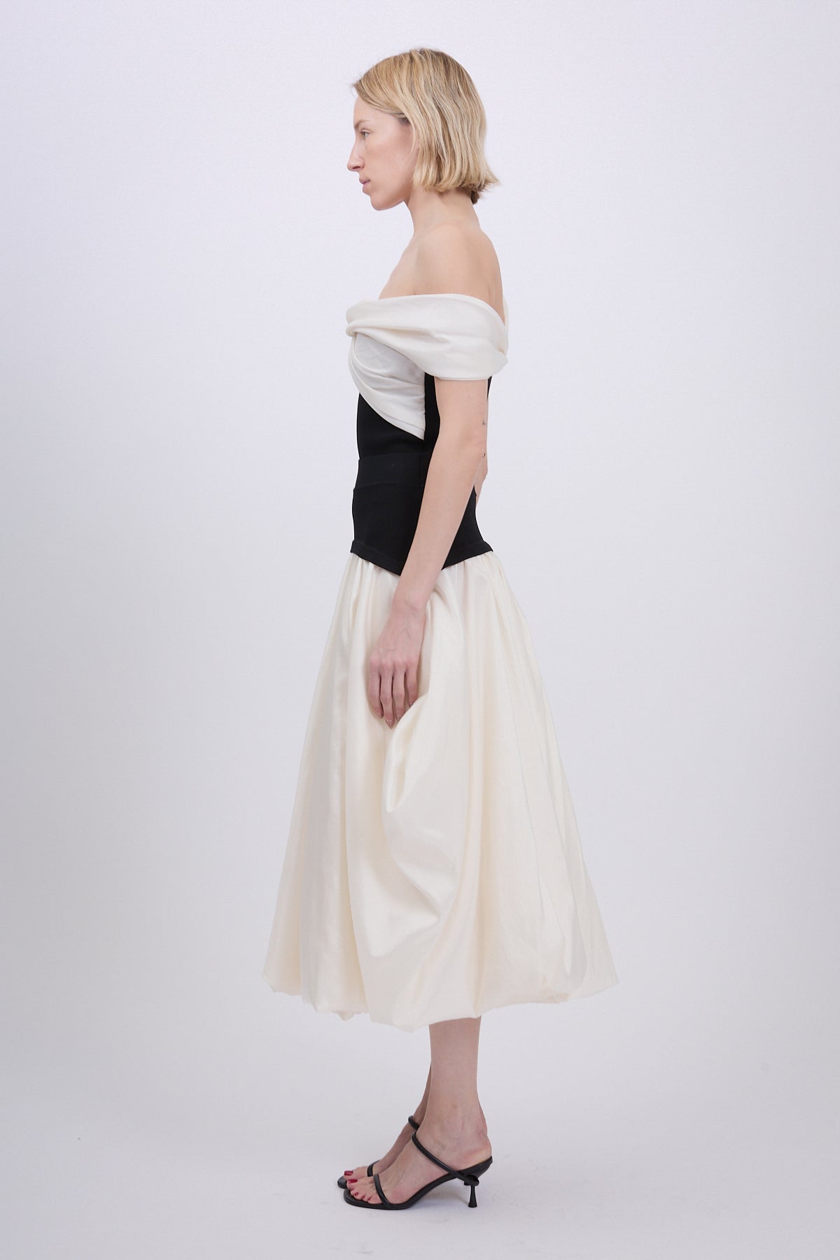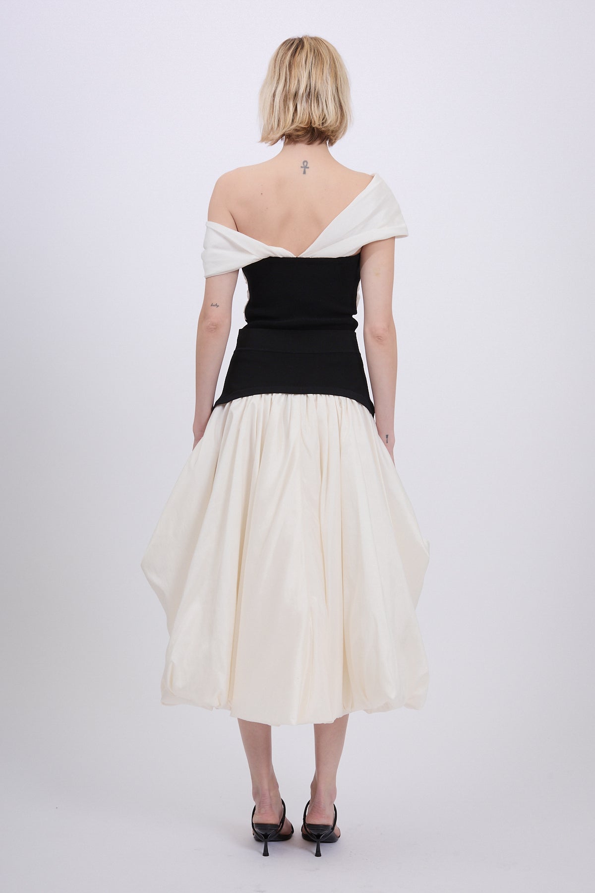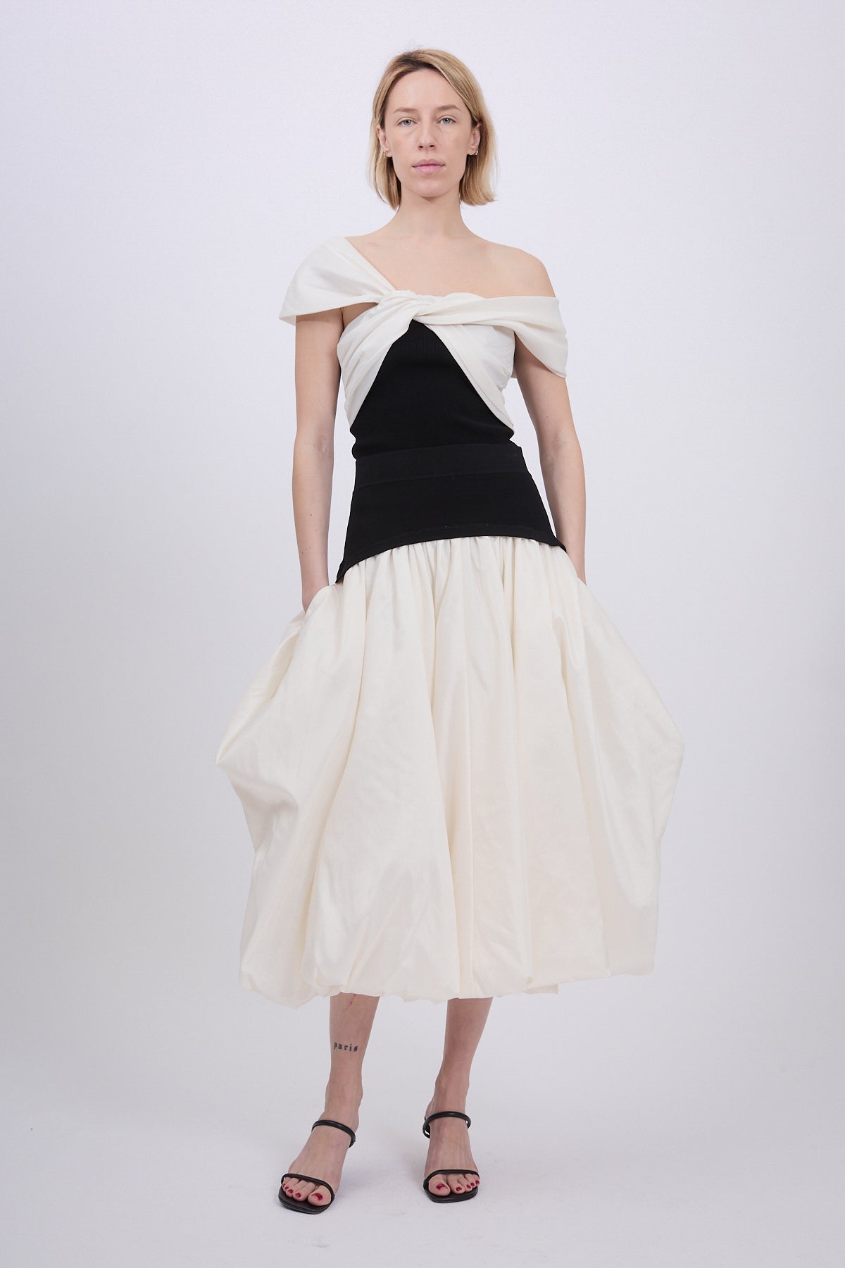 A mixed-media midi skirt with a knit banded waist and full taffeta bubble hem skirt that intentionally gathers at the sides.