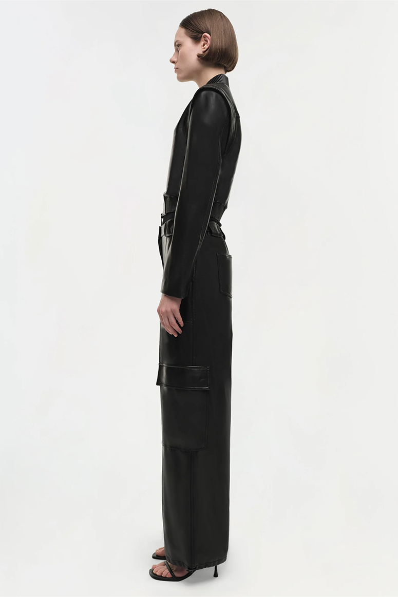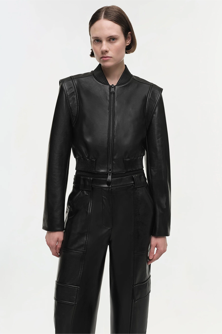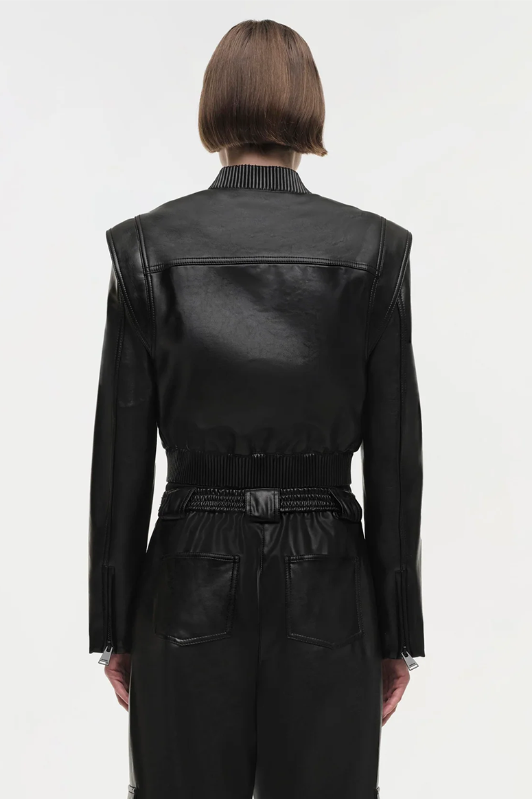 The Doreen Vegan Leather Jacket in Black. Structured bomber silhouette engineered in supple vegan leather. Cropped sportif waist.