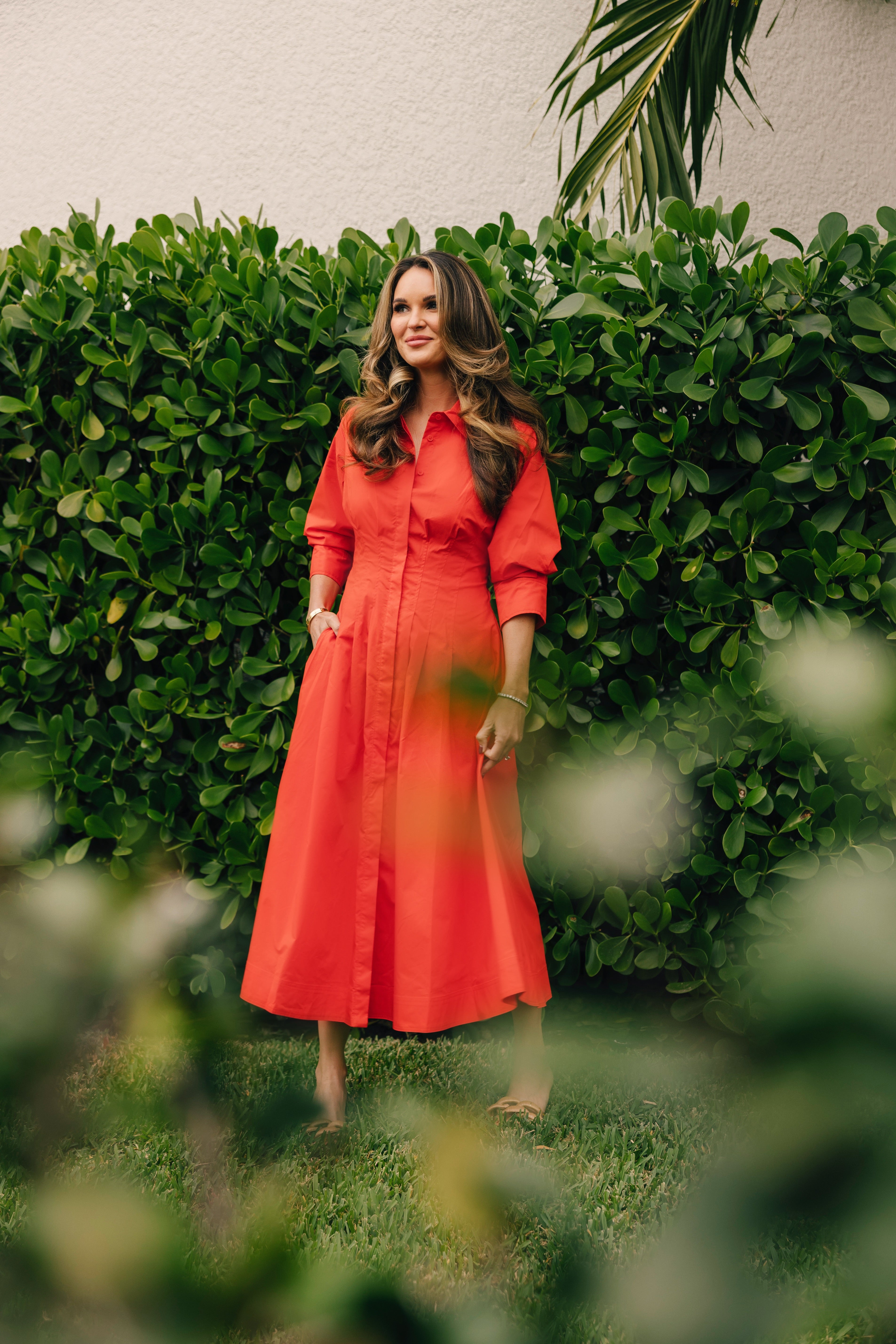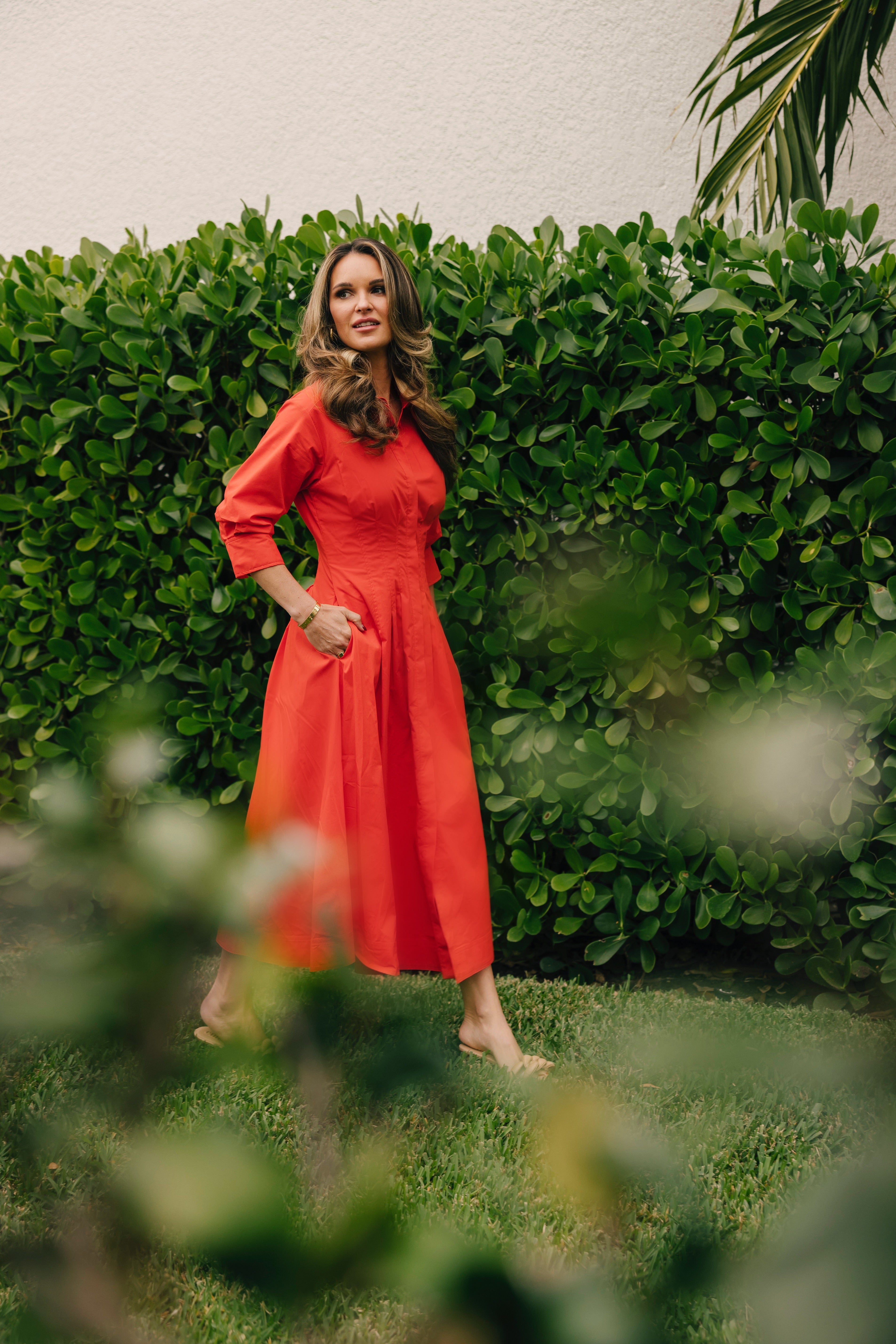 The Jazz Dress in Fiery Red. Crafted in crisp cotton poplin, this pintuck midi combines structure with femininity. Its tailored fit and delicate pintuck details make it an effortless choice for elevated daytime dressing.