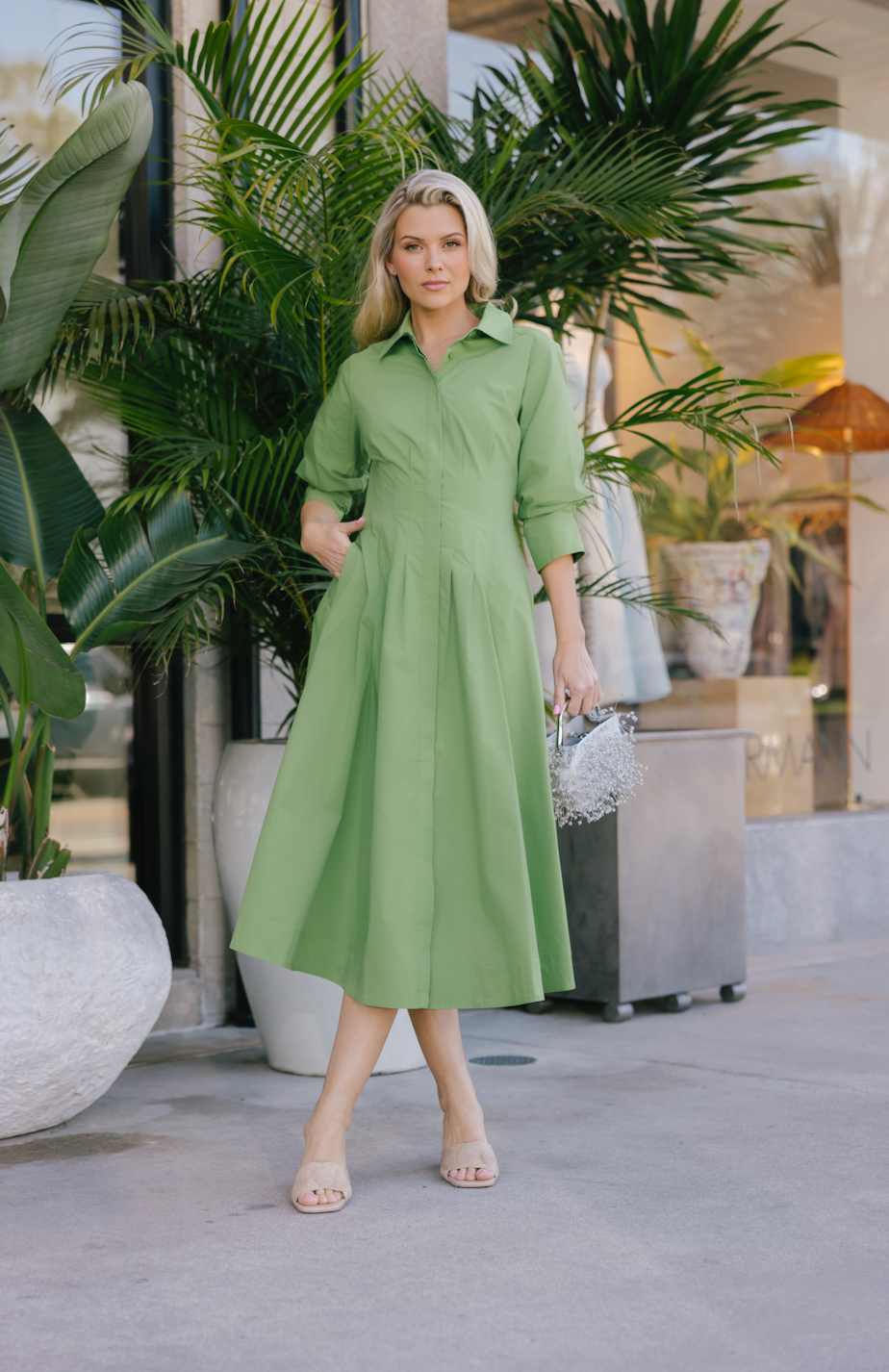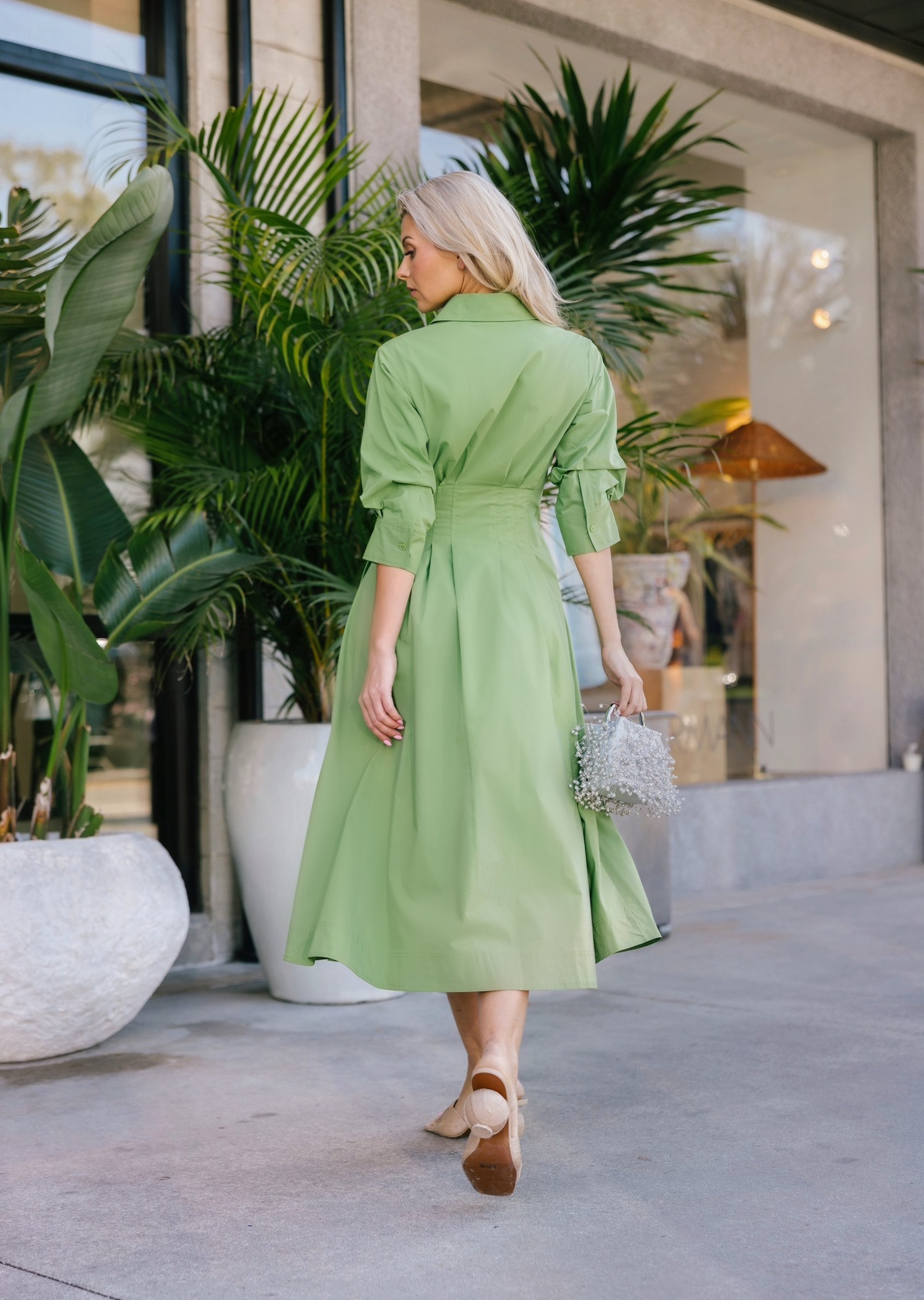 The Jazz Dress in Deep Peridot. Sharp, shirting inspired designs accentuate a pintucked waist, cuffed sleeves and a classic midi length hemline.
