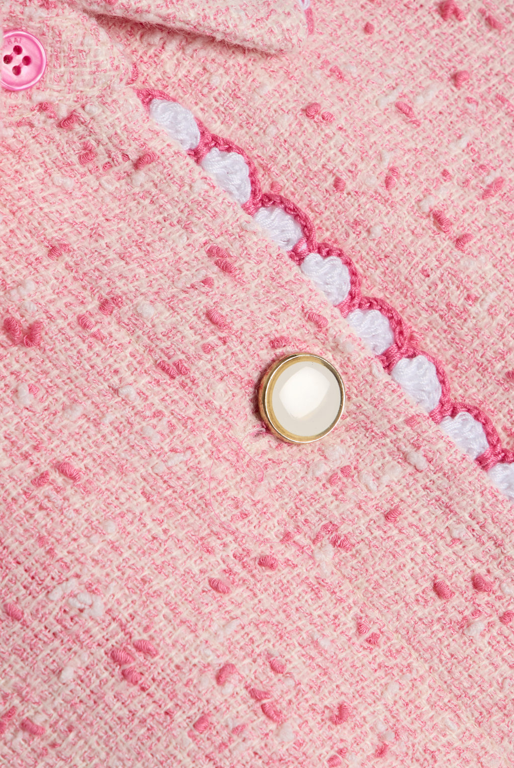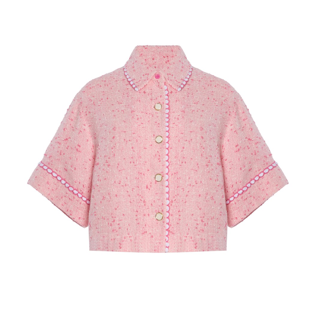 The Khloe Shirt in Berry. This textured tweed short-sleeve button-down is designed as a sophisticated cover-up. Its structured silhouette and refined details make it a seamless transition piece.