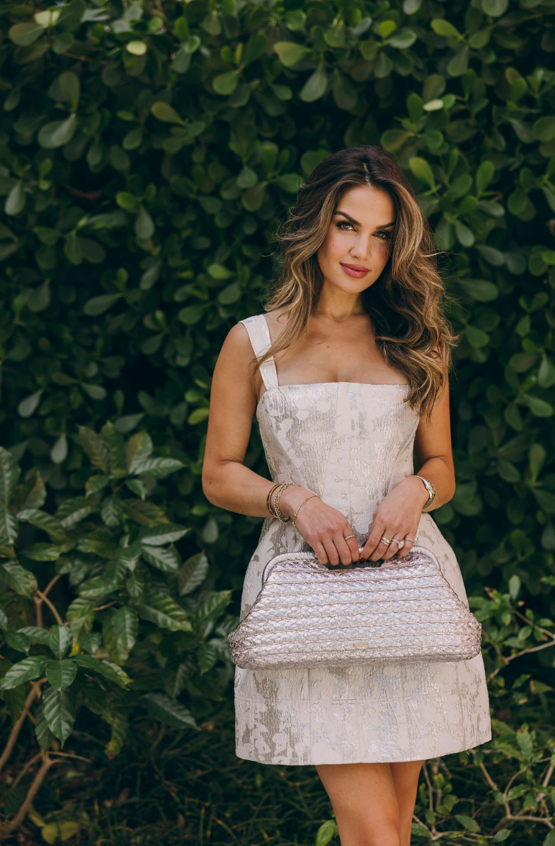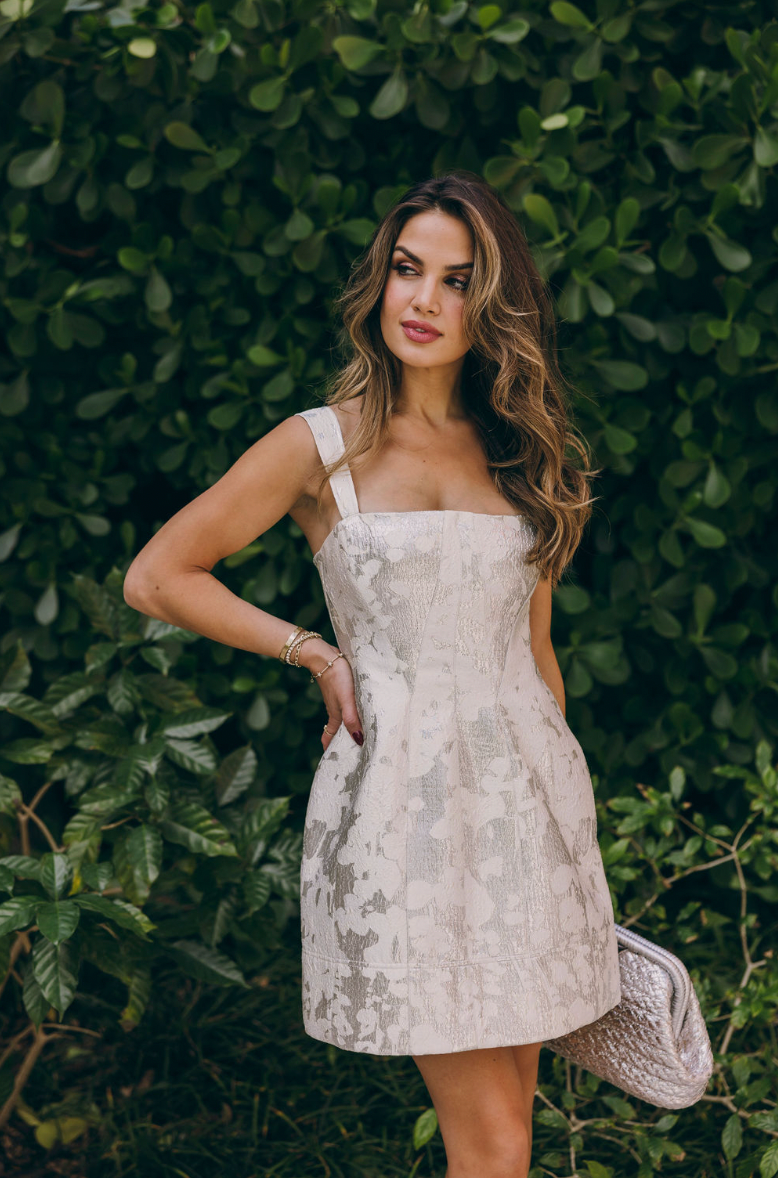 The Lydia Dress in Silver. This sleeveless mini features a contoured design that emphasizes a form-fitting silhouette, accentuated by decorative elements that draw the eye.