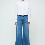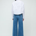 Woman wearing a white blouse with floral embellishments in an outdoor setting.