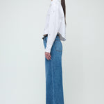 Close-up of a woman wearing a white blouse with decorative buttons.