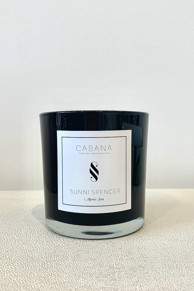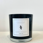 Sunni Spencer private label candle handmade in Tampa FL, set in hand blown glass. "Cabana" has notes of coconut, cedar, sandalwood and green floral...the scent of vacation. Create your own escape at home with our newest fragrance. Reuse the glass as a floral vessel or a brush holder as an idea.