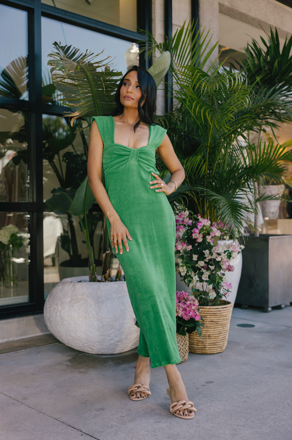Introducing the Capri Cap Maxi Dress - our cap sleeve silhouette in our “everyWEAR towel” dress collection now available in a maxi hemline that stops at the ankle. This style dress has a ruched bodice & elastic back for easy on and off & made of soft terry. This versatile piece is multifunctional. It can be worn getting ready, lounging around, and/or out on the town. Enjoy this piece dressed up with heels and accessories.