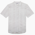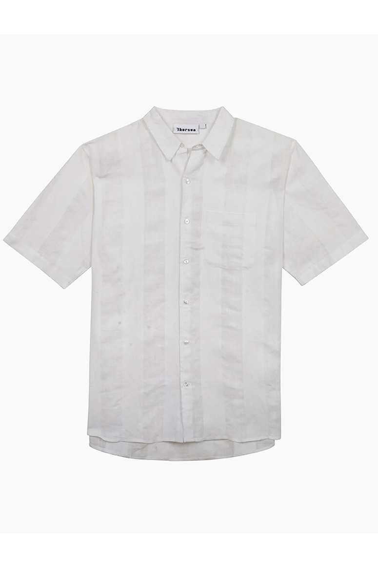 The Linen short sleeve button down shirt with rounded front pocket and tonal Thorsun window embroidery detail. Features a French placket, horn buttons and is made with light-weight linen perfect for warm weather. Fits True to Size