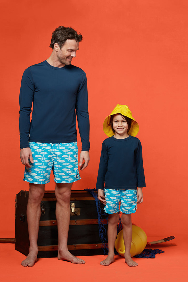 Our new fish print in the most flattering of mid-blue and soft green shades. Wear these to the beach with a white t-shirt or navy polo for a fresh summertime look. Available in matching pairs for men and boys.