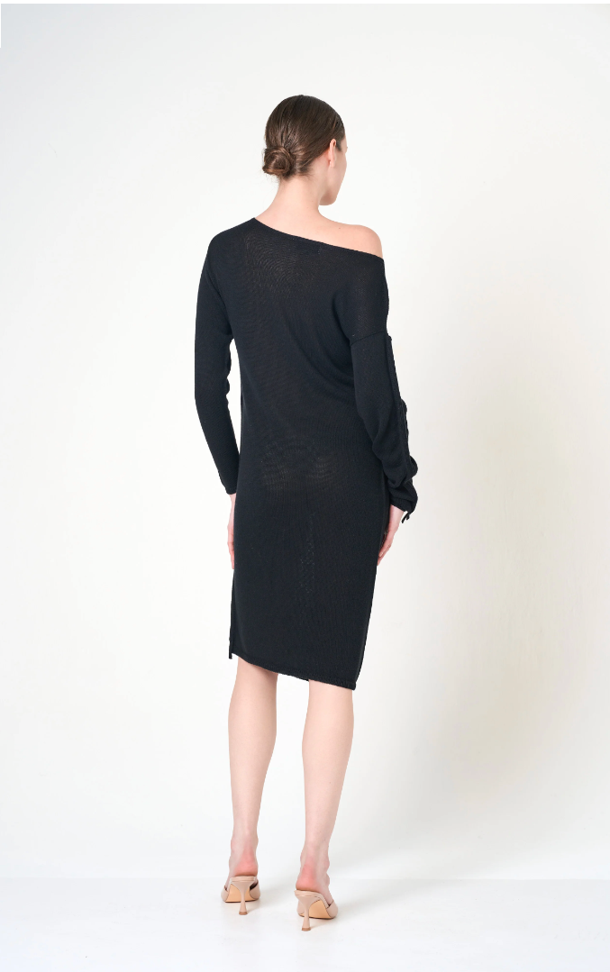 A truly versatile statement piece, crafted in the South of Italy with innovative seamless knitting technology. This ingenious dress features three points of adaptability: an adjustable cord on the sleeve and leg, plus a neckline that easily transitions between an elegant boat neck and an alluring off-the-shoulder look. Made with luxurious organic fibers, it seamlessly adapts your style from day to evening.