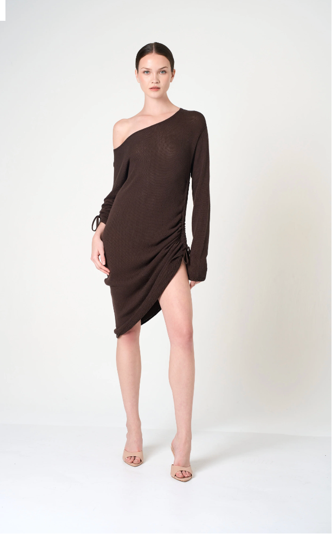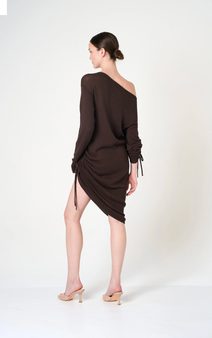 A truly versatile statement piece, crafted in the South of Italy with innovative seamless knitting technology. This ingenious dress features three points of adaptability: an adjustable cord on the sleeve and leg, plus a neckline that easily transitions between an elegant boat neck and an alluring off-the-shoulder look. Made with luxurious organic fibers, it seamlessly adapts your style from day to evening.